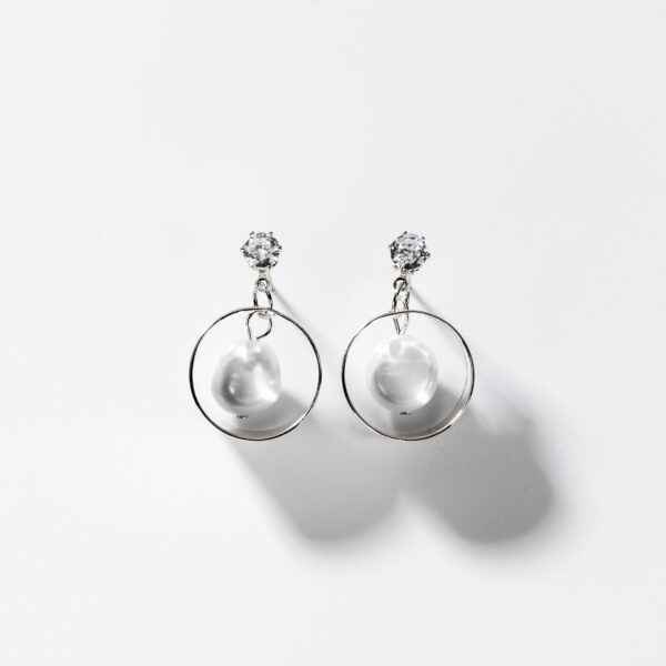 Pendants d’oreilles avec un zircon incrusté à la main et une perle entourée par un petit cercle en métal rhodié.